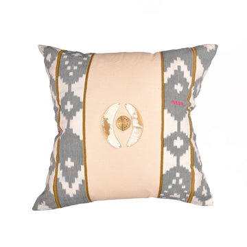 This edition features authentic Baoulé cloth handwoven in Northern Côte d’Ivoire, paired with a beige solid fabric for a modern contrast and adorned with horns and brass ornaments highlighting the African craftsmanship and cultural heritage behind each piece.