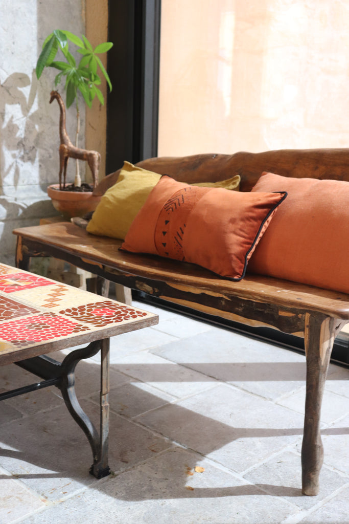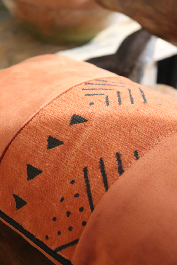 Na Inzo brings the spirit of West African heritage into your home with this handcrafted cushion, featuring traditional bogolan (mud cloth) paired with burnt orange velvet backing. The result is a piece that radiates warmth and elegance.