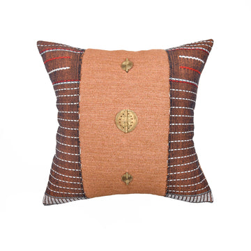 Handcrafted with authentic Senufo textile, this cushion combines traditional handwoven cotton strips from Côte d’Ivoire with plain orange fabric for a sleek contrast. Finished with elegant brass ornaments, it offers a refined design that celebrates African craftsmanship.